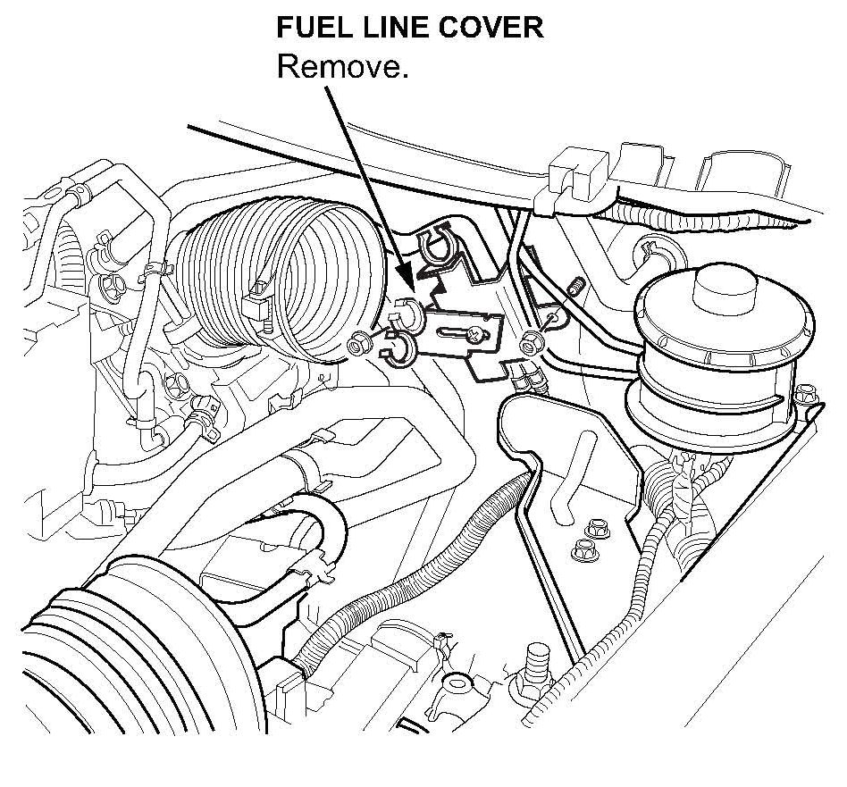 5. Remove the fuel line cover on the bulkhead by disconnecting the two heater hoses and the fuel pressure line from the clamps, then remove the two nuts.