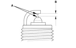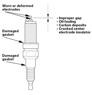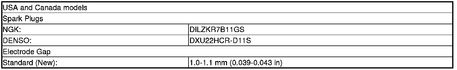 2. Replace the plug at the specified interval, if the center electrode (A) is rounded, if the spark plug gap (B) is out of specification, or if the spark plug electrode is dirty or contaminated. Use only the spark plugs listed.