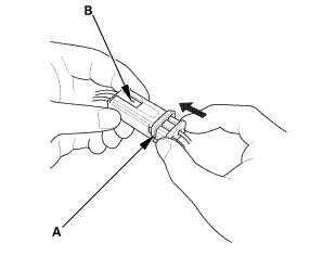 To reconnect, hold the pawl-side connector, and press on the back of the sleeve-side connector in the direction shown. As the two connector halves are pressed together, the sleeve (A) is pushed back by the pawl (B). Do not touch the sleeve.
