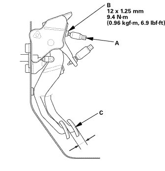 3. Back off clutch pedal position switch B until it no longer touches the clutch pedal (C).