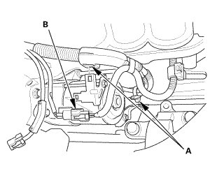 2. Install the starter, then loosely install the upper mounting bolt (A) and the lower mounting bolt (B).