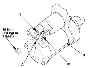 2. Check the hold-in coil for continuity between the S terminal and the armature housing (ground) (B). There should be continuity: