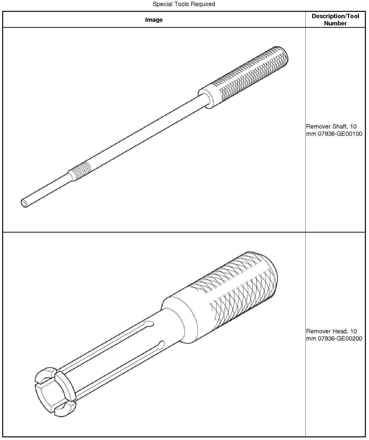 1. Remove the selector control shaft bearing using the 10 mm remover shaft, the 10 mm remover head, and the remover weight.