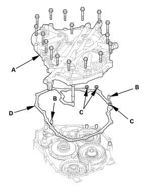 1. Remove the end cover (A), the dowel pins (B), the O-rings (C), and the end cover gasket (D).