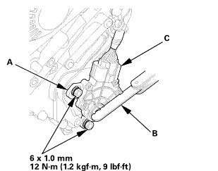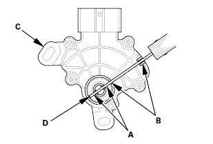 2. Align the cutouts (A) on the rotary-frame with the neutral positioning cutouts (B) on the transmission range switch (C), then put a 2.0 mm (0.079 in) feeler gauge blade (D) in the cutouts to hold the switch in the N position.