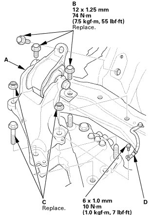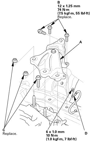 1. Install the transmission mount (A), and tighten the new transmission mount mounting bolts (B) and loosely install the new transmission mount bracket mounting bolt and nuts (C).