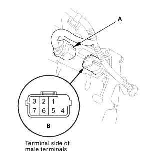 2. Measure the resistance between shift solenoid wire harness 7P connector (B) terminals No. 5 and No. 6 for ATF temperature sensor.