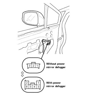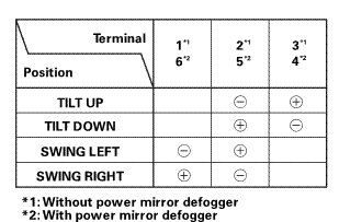 4. Check for continuity between power mirror connector terminals No. 1 and No. 3. There should be continuity. If the resistance is not as specified, check for an open or high resistance in the wire between the connector and mirror holder. If the wire is OK, replace the mirror holder.