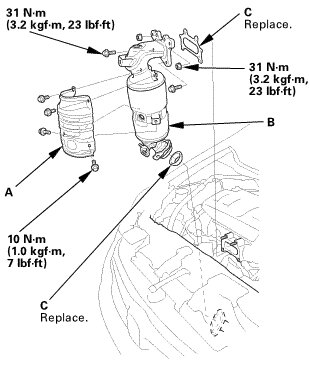* Apply a 5 mm (0.20 in) diameter bead of liquid gasket to the mating surfaces (C).
