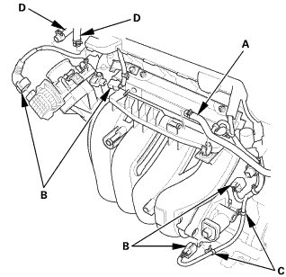 1. Install the intake manifold and throttle body assembly (A) with new gaskets (B).