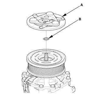 1. Install the armature plate (A) and the shim(s) (B), taking care not to lose the shim(s). If the clutch needs adjustment, increase or decrease the number and thickness of shims as necessary, then reinstall the armature plate, and recheck its clearance.