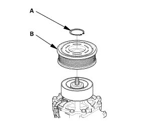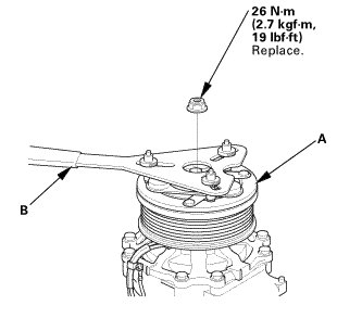 1. Remove the center nut while holding the armature plate (A) with the A/C clutch holder (B).