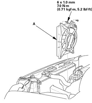 1. Remove the A/C condenser fan shroud assembly (A).