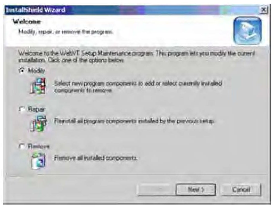 7. If you have a previous version of the WebVT software installed on your computer, the InstallShield Wizard gives you the option to modify, repair, or remove the software. Select Modify then Next.