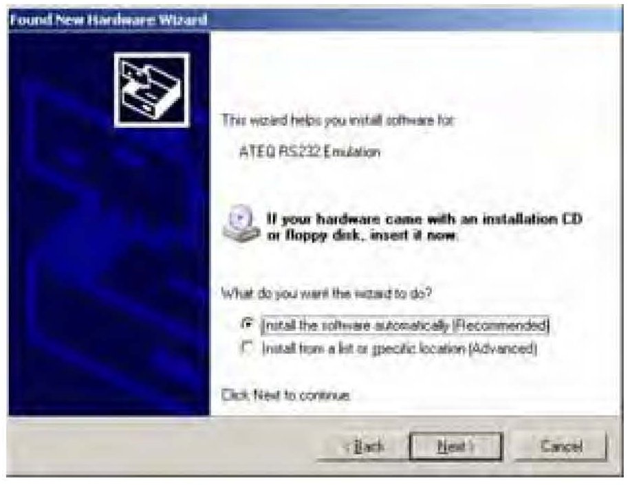 4. The Found New Hardware Wizard prompts you to install the ATEQ RS232 Emulation software. Select Install the software automatically (Recommended), then select Next.