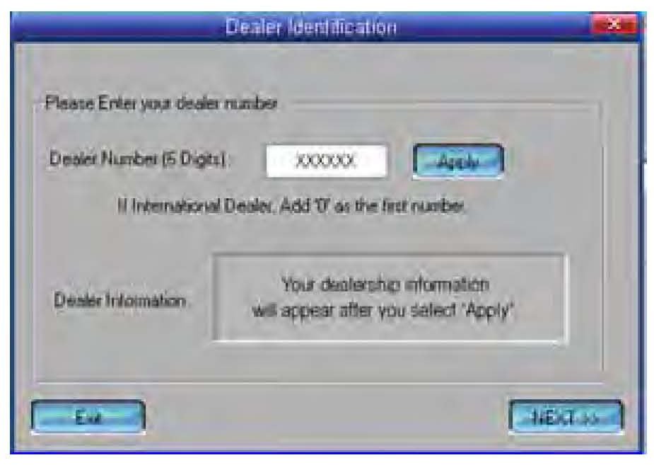 8. The Dealer Identification screen appears. Enter your 6-digit dealer number, then select Apply.