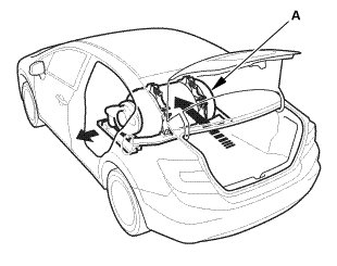 1. With the help of two other technicians, lift the frame, and slide the entire fuel tank assembly (A) into the passenger compartment from outside the vehicle. Be careful not to damage the fuel joint block.