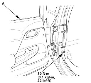 * Loosen the hinge mounting bolts (A) slightly, and move the door backward or forward, up or down as necessary to equalize the gaps.