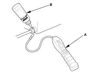 9. Within 1 minute, check for any damaged lines with a leak detector (A) (Snap-on Combustible Gas Leak Detector or Snoop Liquid Leak Detector (B)).