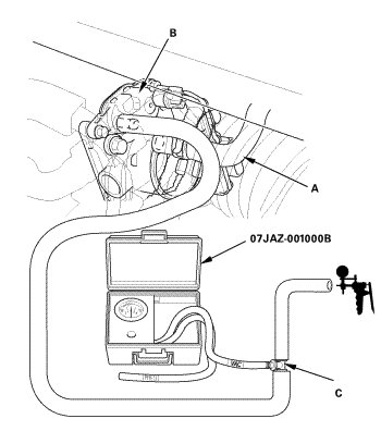 -2. Disconnect the vacuum hose (A) from the EVAP canister purge valve (B) in the engine compartment, then connect a T-fitting (C), a vacuum gauge, and a vacuum pump/gauge, 0-30 inHg, to the EVAP canister purge valve as shown.