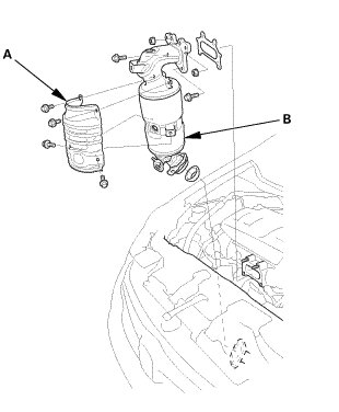 2. Remove the catalytic converter cover (B).