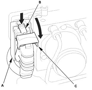 4. Disconnect the connector (A) by pushing the lock (B) and pulling down the lever (C); the connector disconnects itself.