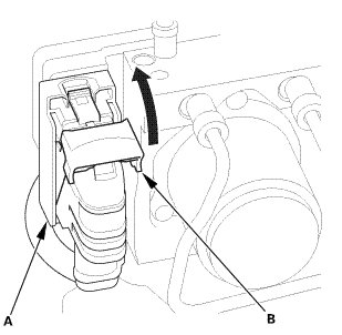4. Pull up the lever (B) of the connector, then confirm the connector is fully seated.