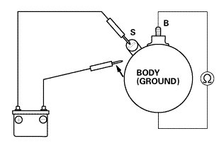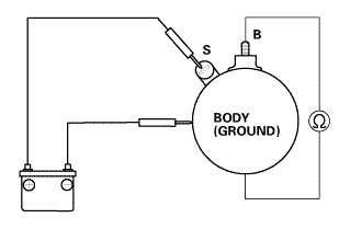 3. Connect the battery as shown, and check for continuity between the B terminal and the starter body. If there is continuity, it is working properly.