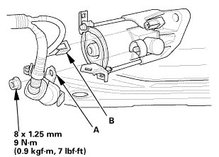 2. Install the starter, then loosely install the upper mounting bolt (A) and the lower mounting bolt (B).