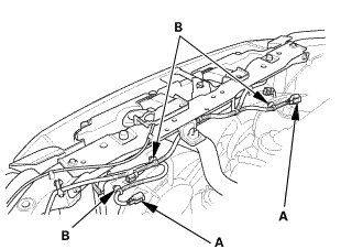 1. Remove the radiator mount upper brackets/cushions (A), and the A/C condenser upper mount brackets (B).