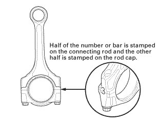 1. Each connecting rod has a tolerance range from 0 to 0.024 mm (0.00094 in), in 0.006 mm (0.00024 in) increments, depending on the size of its big end bore. It's then stamped with a number or bar (1, 2, 3, or 4/I, II, III, or IIII) indicating the range. You may find any combination of numbers and bars in any engine. (Half the number or bar is stamped on the rod cap, the other half is on the connecting rod.) If you cannot read the code because of an accumulation of oil and varnish, do not scrub it with a wire brush or scraper. Clean it only with solvent or detergent.