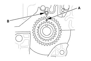 1. Set the crankshaft to top dead center (TDC). Align the TDC mark (A) on the crankshaft sprocket with the pointer (B) on the engine block.
