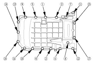 1. Remove all of the old liquid gasket from the oil pan mating surfaces, the bolts, and the bolt holes.