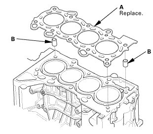 3. Install the new cylinder head gasket (A) and the dowel pins (B) on the engine block. Always use a new cylinder head gasket.