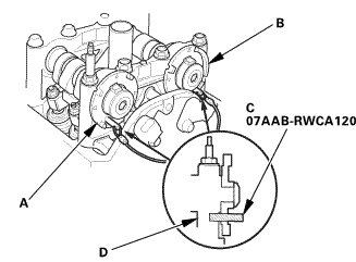 1. To hold the intake camshaft, insert a camshaft lock pin set (C) into the maintenance hole in CMP pulse plate A and through the No. 5 rocker shaft holder (D).