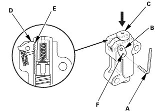 1. Compress the auto-tensioner when replacing the cam chain. Remove the pin (A) from the auto-tensioner that was installed during removal. Turn the plate (B) counterclockwise, to release the lock, then press the rod (C), and set the first cam (D) to the first edge of the rack (E). Insert the 1.2 mm (3/64 in) diameter pin back into the holes (F).