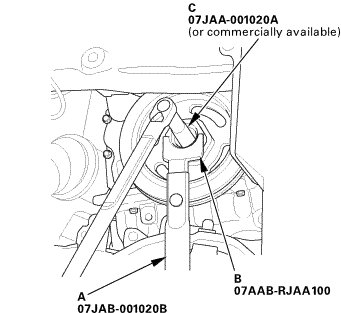 3. Torque the bolt to 50 Nm (5.1 kgfm, 37 lbfft) with a torque wrench and a socket, 19mm(C). Do not use an impact wrench. If the pulley bolt or crankshaft are new, torque the bolt to 177 Nm (18.0 kgfm, 131 lbfft), then remove the bolt and torque it to 50 Nm (5.1 kgfm, 37 lbfft).