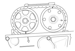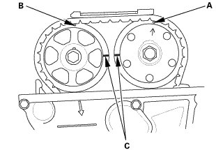 1. Set the No. 1 piston at top dead center (TDC). The punch mark (A) on the VTC actuator and the punch mark (B) on the exhaust camshaft sprocket should be at the top. Align the TDC marks (C) on the VTC actuator and the exhaust camshaft sprocket.