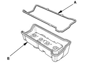 3. Install the head cover gasket (A) in the groove of the cylinder head cover (B). Make sure the head cover gasket is seated securely.