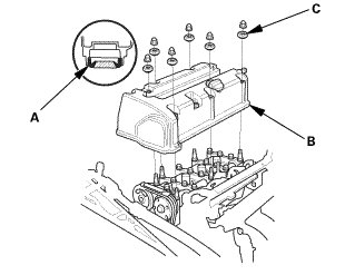 7. Set the spark plug seals (A) on the spark plug tubes. Place the cylinder head cover (B) on the cylinder head, then slide the cover slightly back and forth to seat the head cover gasket.