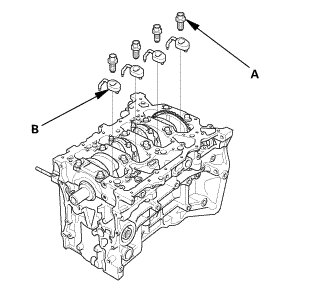 1. Remove the oil jet bolts (A) and the oil jets (B).