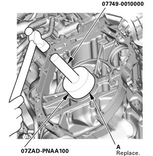 3. Use the driver handle, 15 x 135L and the oil seal driver attachment, 96 mm to drive a new crankshaft oil seal (A) squarely into the engine block to the specified installed height.