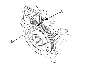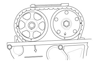 1. Set the No. 1 piston at top dead center (TDC). The punch mark (A) on the VTC actuator and the punch mark (B) on the exhaust camshaft sprocket should be at the top. Align the TDC marks (C) on the VTC actuator and the exhaust camshaft sprocket.