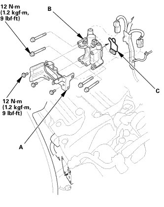 2. Install the rocker arm oil control valve assembly (B) and the rocker arm oil control valve filter (C).