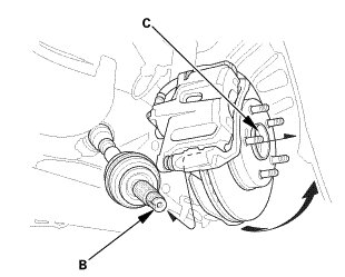 2. Install the outboard joint (B) into the front hub (C) on the knuckle.