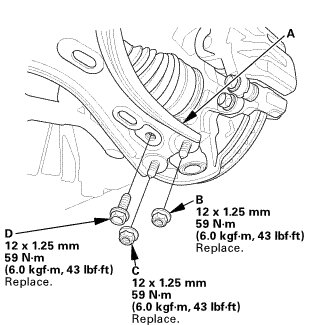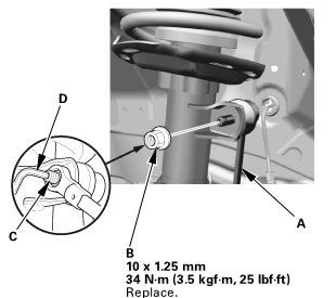 2. After lightly tightening all three fasteners, tighten them to the specified torque in the following order; the nut on the front (B), the nut on the rear (C), then the bolt (D).