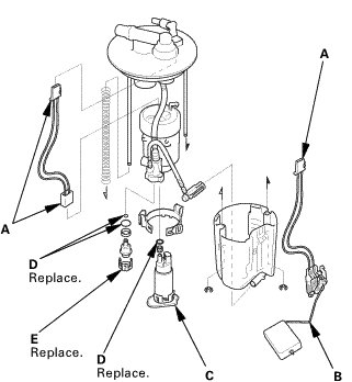 * When installing the fuel gauge sending unit (B), make sure the connection is secure and the connector is firmly locked into place. Be careful not to bend or twist it excessively.