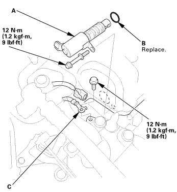 1. Install the VTC oil control solenoid valve (A) with a new O-ring (B).