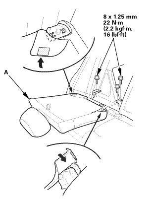 2. Install the bolt (A) securing the rear seat cushion (B).