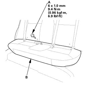 1. Remove the bolt (A) securing the rear seat cushion (B).